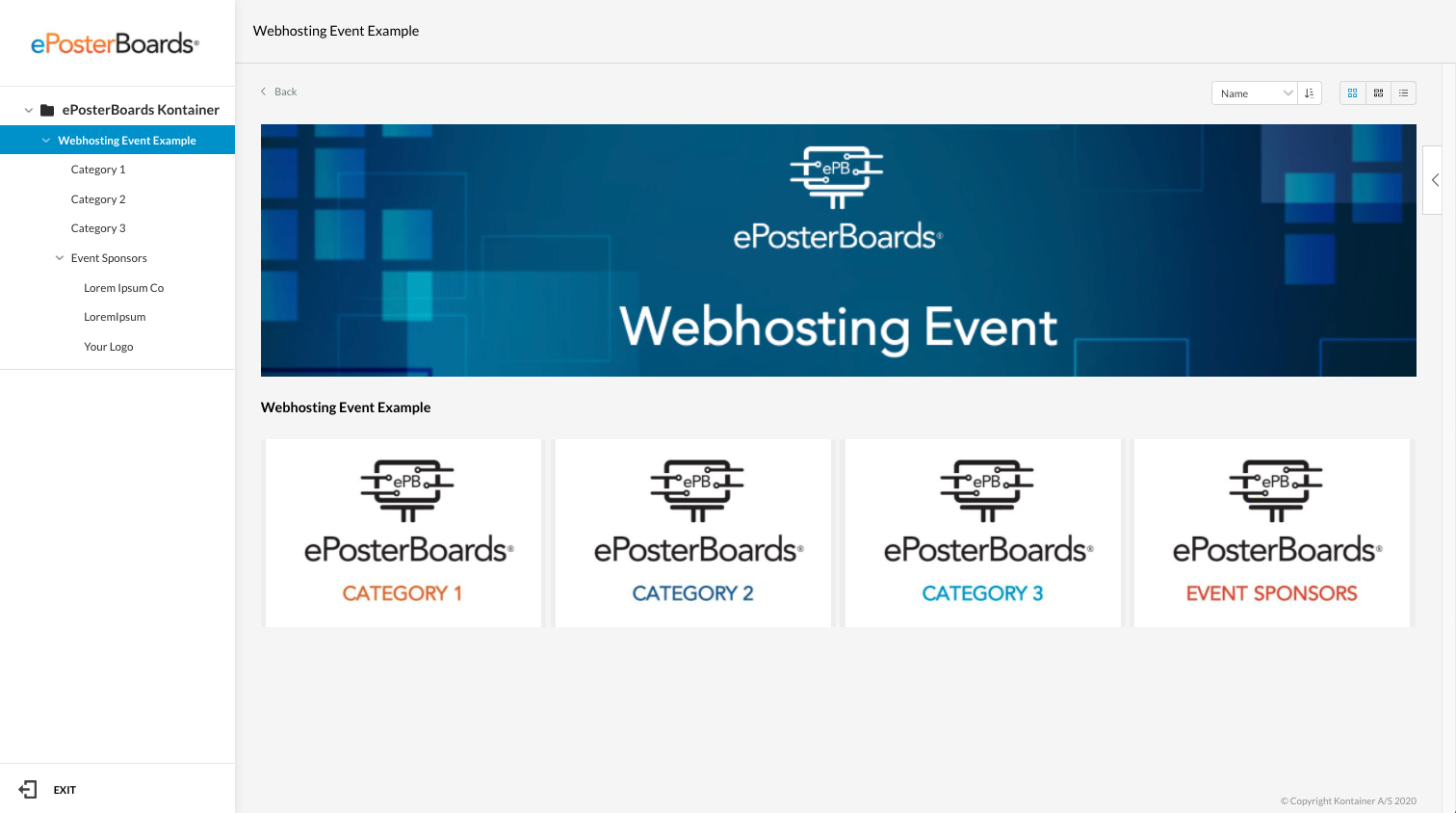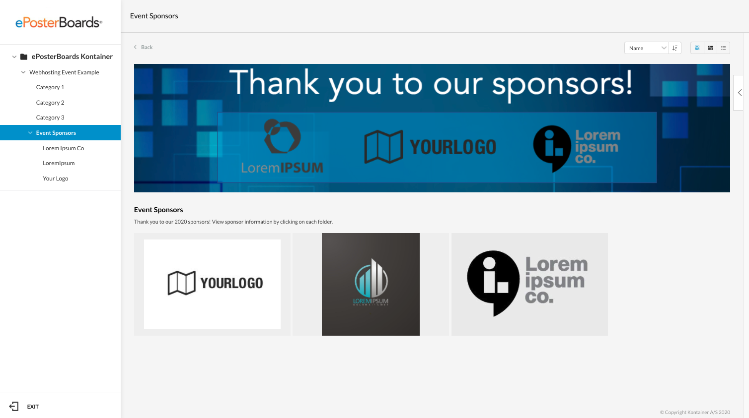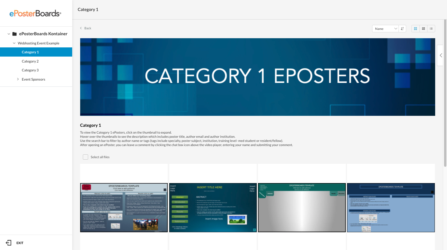 Group the webhosting content into as many categories as you like. ePosters can be grouped into multiple subcategories as well. Other categories can include sponsors, virtual exhibit halls, marketing material and more! Each category can display a different banner and description.